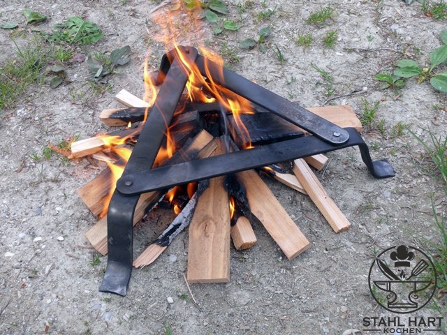 Einfach und unkompliziert eine Pfanne oder einen Topf über das offene Feuer stellen - mit dem zusammenklappbaren Dreibein aus Schmiedeeisen ist dies möglich.